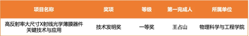 王占山教授主持完成的"高反射率大尺寸X射线光学薄膜器件关键技术与应用"项目获技术发明奖一等奖。该项目突破了X射线光学薄膜制备关键技术,解决了我国大科学装置发展的光学元件性能瓶颈问题。